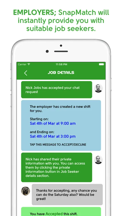 Make sure you keep SnapMatch app installed and your availability up-to-date so you don't miss out on any new employer chat requests and job offers!