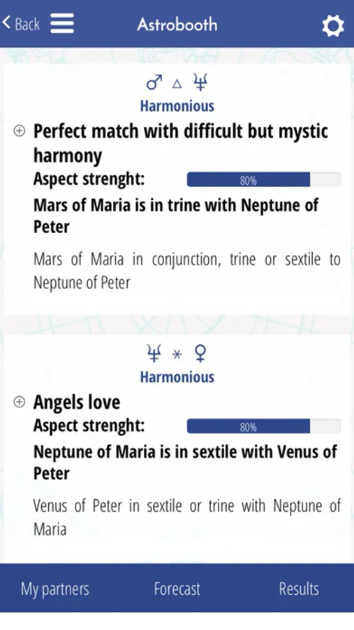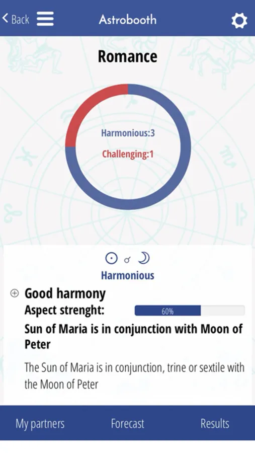 The forecast gives you the full list of the most important aspects that are at work in your relationship synastry.