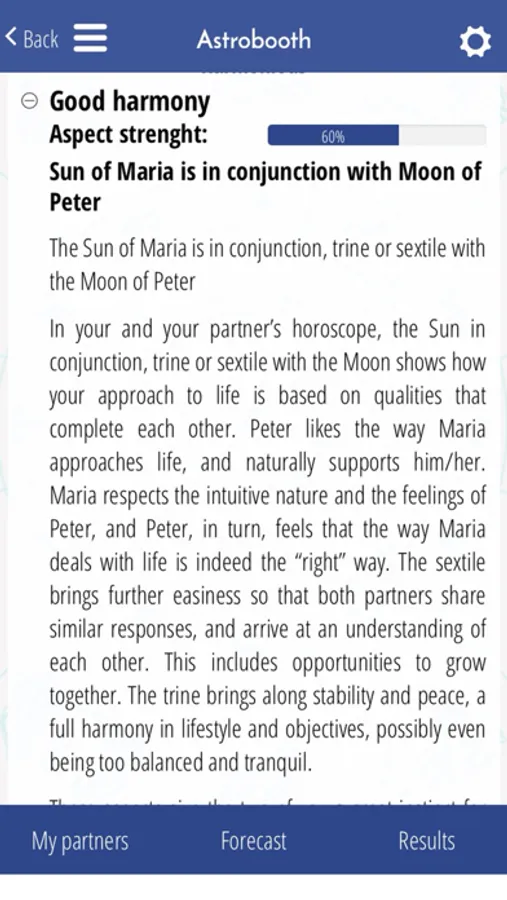 Astrobooth gives you a short and comprehensive forecast based on the key most positive and most challenging aspects you have as a couple, reflected in the type of relationship. In astrology, as in life, there are specific indicators of what exactly is the real potential of your connection, based on the planet’s place and aspects between them. Every aspect, if present, is described in a short article aimed at providing the reader an understanding of the forces that are shaping your relation to each other.