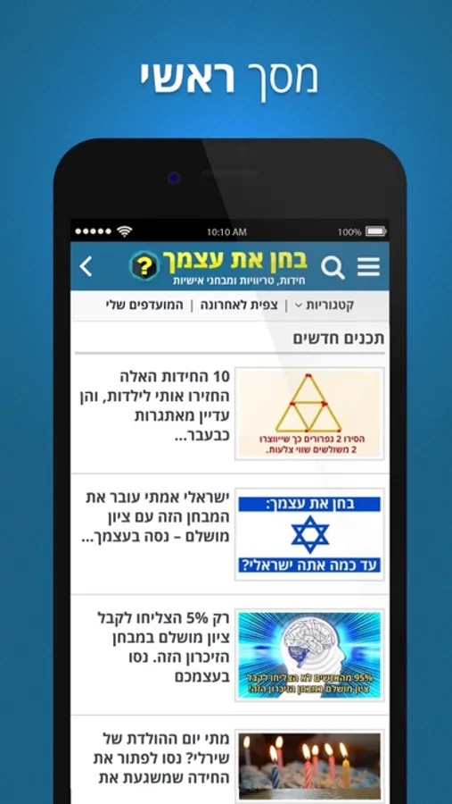 באפליקציה תוכלו למצוא מבחני בחן את עצמך בנושאים שונים, חידוני ידע כללי, שעשועי טריוויה, חידות לילדים, חידות למבוגרים,