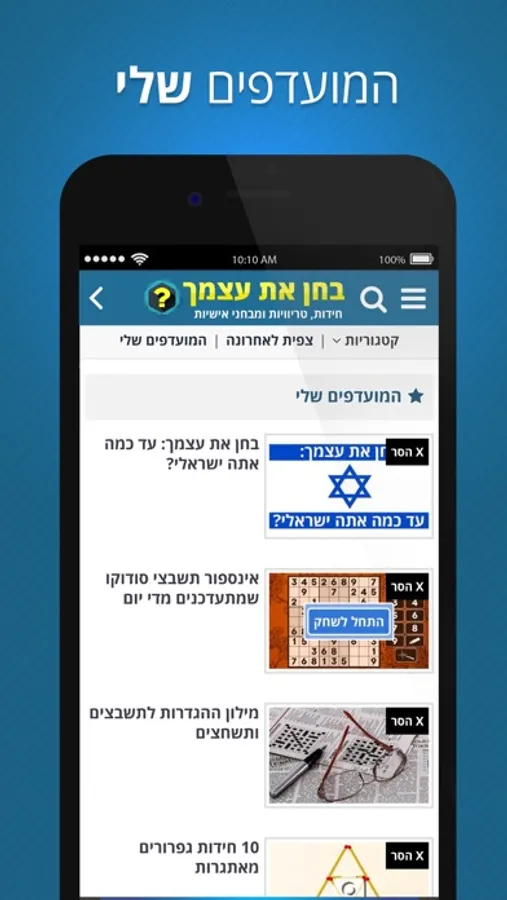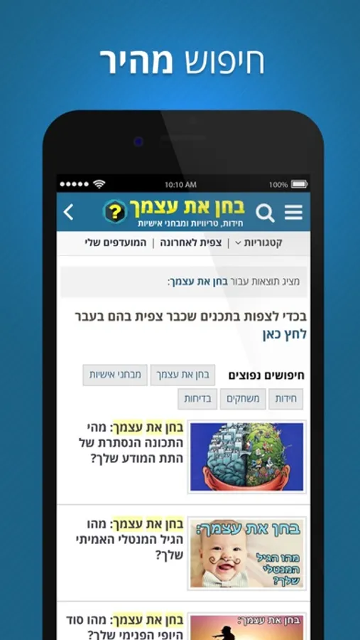 אפליקציית "בחן את עצמך" מגישה לכם מאות חידוני טריוויה, מבחני אישיות וחידות בנושאים שונים. האפליקציה תספק לכם