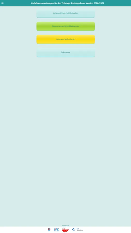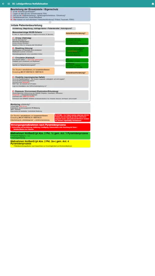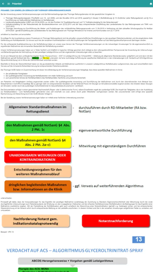 Unsere Verfahrensanweisungen für den Thüringer Rettungsdienst sollen bei der praktischen Implementierung des Notfallsanitätergesetzes in Thüringen helfen, um eine landesweite einheitliche Umsetzung der einzelnen Maßnahmen und Versorgungsstrategien zu ermöglichen. Mit unserer kostenlosen App möchten wir als die am Thüringer Notarzt- und Rettungsdienst involvierten ärztlichen Gremien den Thüringer Rettungsdienstschulen, den Ärztlichen Leitern Rettungsdienst, insbesondere aber den Notfallsanitäterinnen und Notfallsanitäter, die im Freistaat Thüringen aktiv tätig werden oder es bereits sind, einen Handlungsrahmen vorgeben. Dieser ist gleichzeitig als Handlungsempfehlung für Notärztinnen und Notärzte zu sehen, dabei ist es den ärztlichen Kolleginnen und Kollegen unbenommen, weitere Maßnahmen bei der Diagnostik und Therapie zu ergreifen. Die Anweisungen sind - den gesetzlichen Vorgaben folgend - entsprechend den jeweiligen Handlungskompetenzen, also Notkompetenz- oder Maßnahmen nach Delegation (s.a. NotSanG §4 Abs. 2 Pkt. 1c und 2a-c), farblich unterschiedlich gestaltet, die grundsätzlich in unserem Leitalgorithmus geregelt sind.