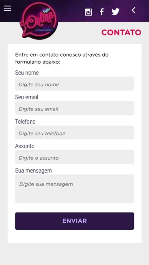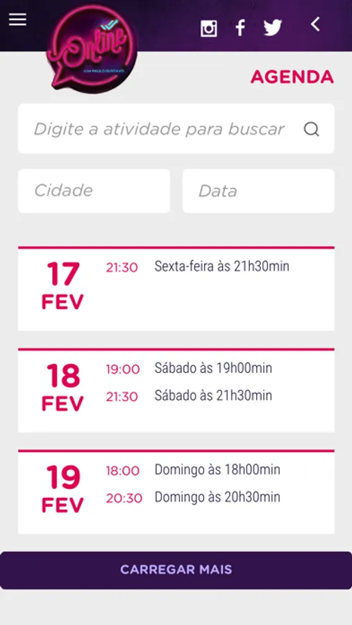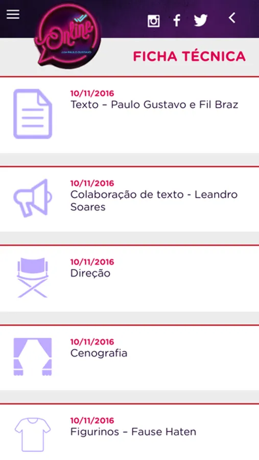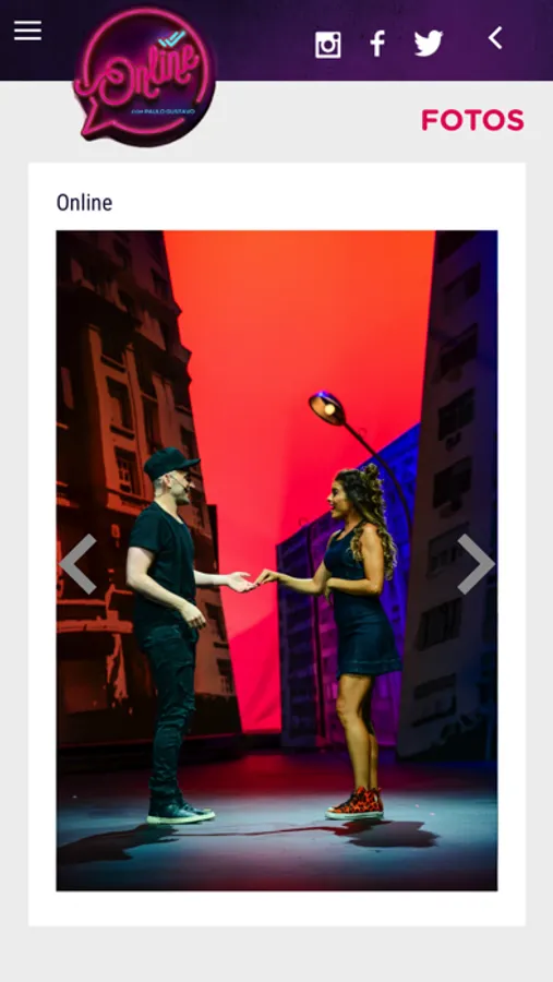O aplicativo do espetáculo Online, protagonizado pelo humorista Paulo Gustavo e um elenco de atores reconhecidos no cenário nacional, traz as informações completas sobre a peça. Saiba os locais por onde a peça se apresentará conferindo a agenda oficial. Curta as fotos e vídeos documentados a cada espetáculo, os posts nas redes sociais do humorista e com toda comodidade você pode adquirir o ingresso e garantir boas risadas.