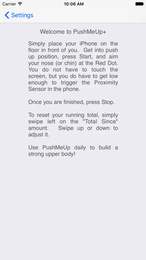 PushMeUp+ uses the Proximity Sensor in your iPhone to detect your push ups and increment the counter. The app also stores your running total, so you can set daily, weekly or monthly goals.