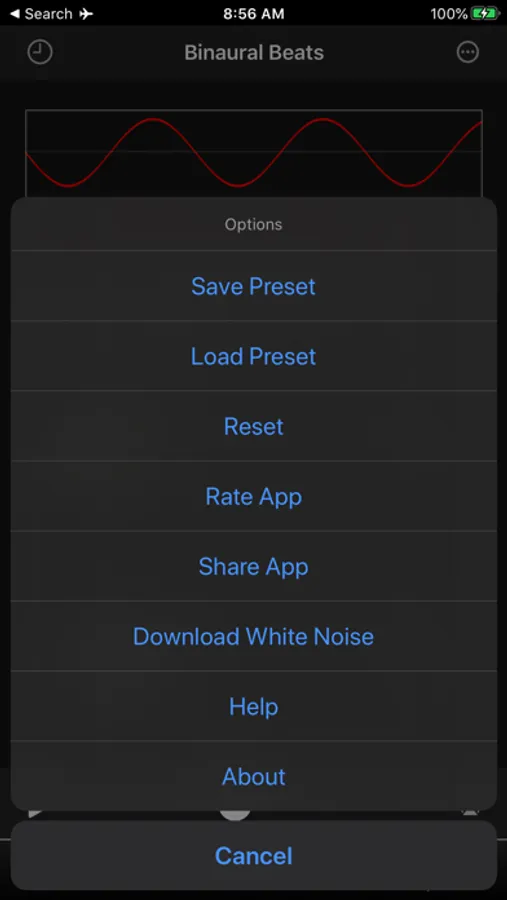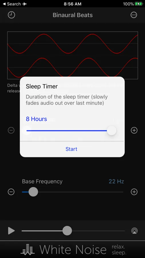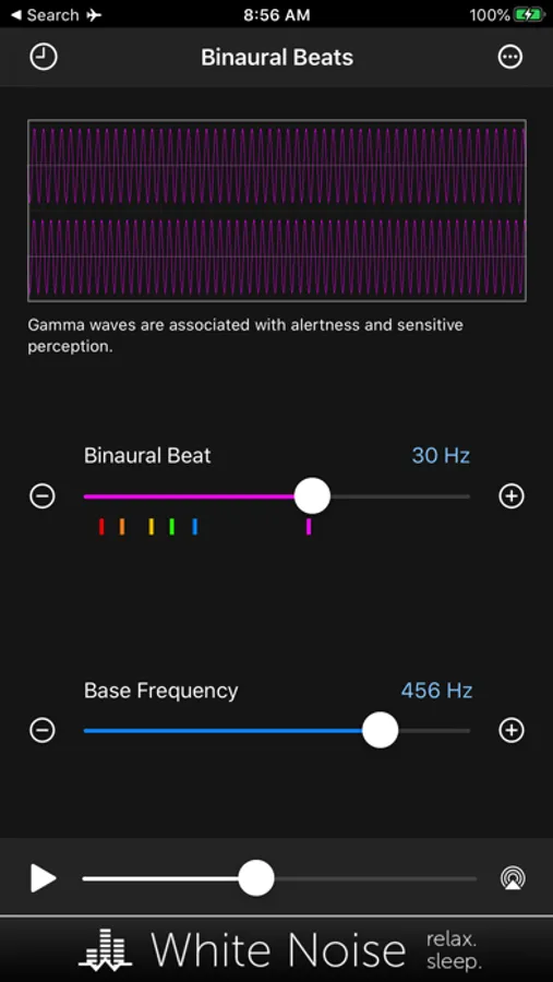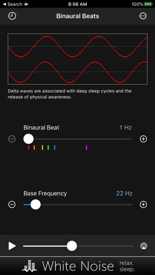 Drag slider to select a desired Binaural Beat from 1 to 50 Hz. Next, drag the base frequency to a tone that sounds pleasant to your ears. The binaural beat is generated around this base frequency. Adjust device volume using the on-screen volume slider to a comfortable level. You can also specify to play audio to any AirPlay supported device. Toggle audio playback using the Play/Pause button.