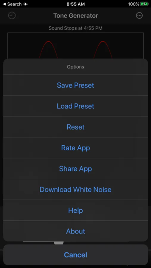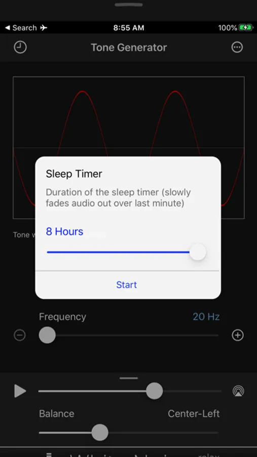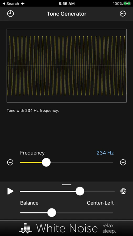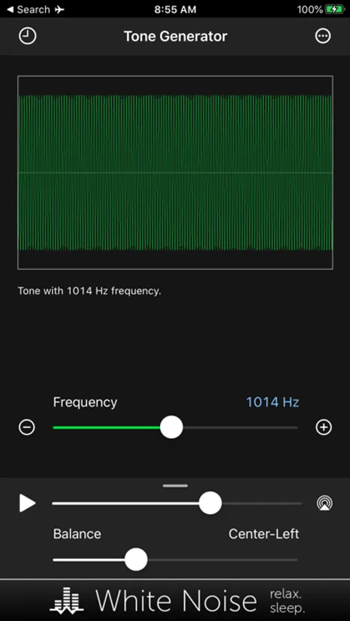 Adjust audio frequency by dragging the slider or tapping the plus/minus buttons. Adjust device volume using the on-screen volume slider. You can also specify to play audio to any AirPlay supported device. Toggle audio playback using the Play/Pause button.