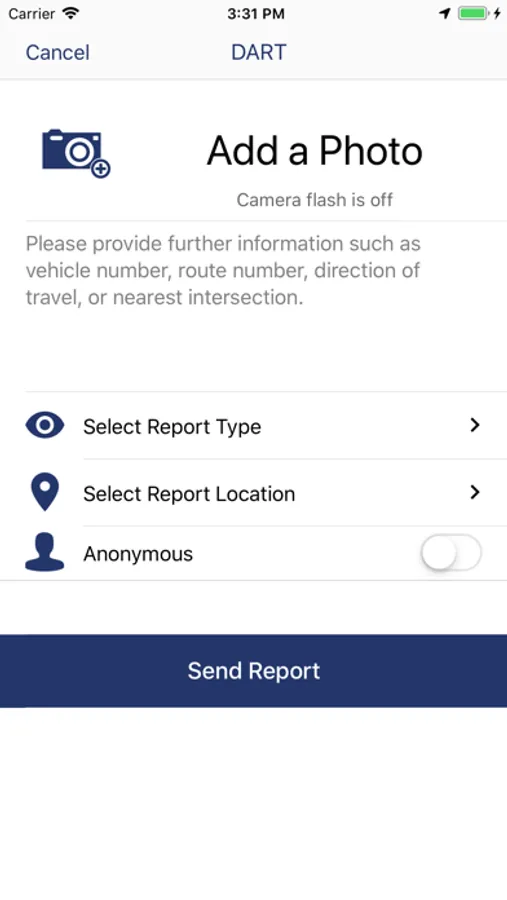 * The “Report an Incident” button allows users to send text or photos directly to Dallas Area Rapid Transit. To ensure discretion, the camera flash is automatically disabled when photos are taken through the app. When reporting an issue, users can select locations and report categories. Riders can also send reports anonymously if they choose.