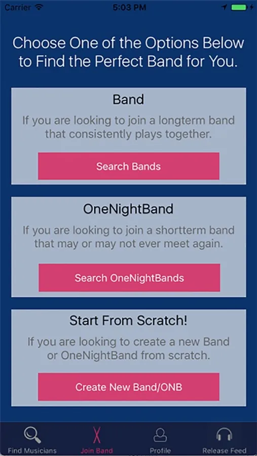 OneNightBand(ONB) is an app that allows musicians to find other musicians to play with. This app is the perfect tool for musicians who need to fill a hole in their band, are travelling and want to play with local artists from the cities they visit, or whose current friends simply suck at playing instruments.