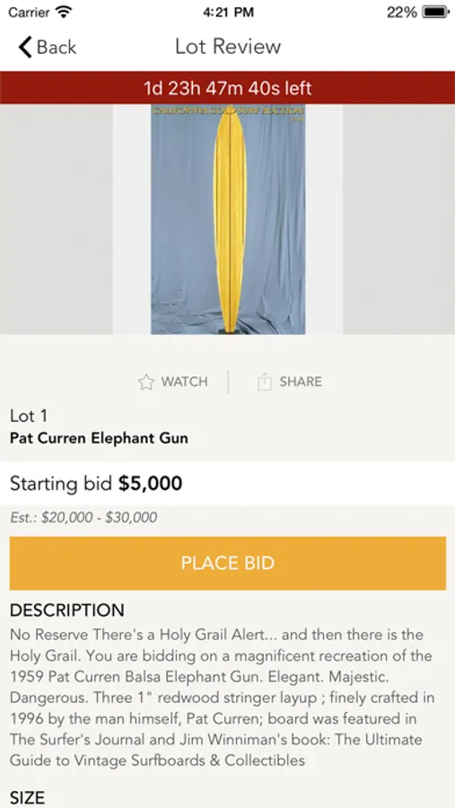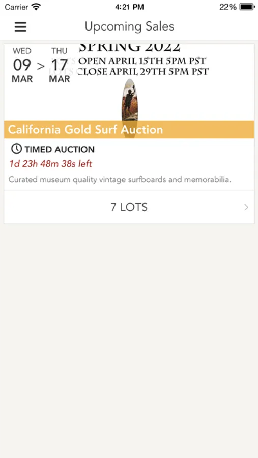 With California Gold Surf Auction app you can preview, watch, and bid in our auctions all from your mobile phone. Participate in our sales while on the go or at your leisure from your mobile device and gain access to the following features: