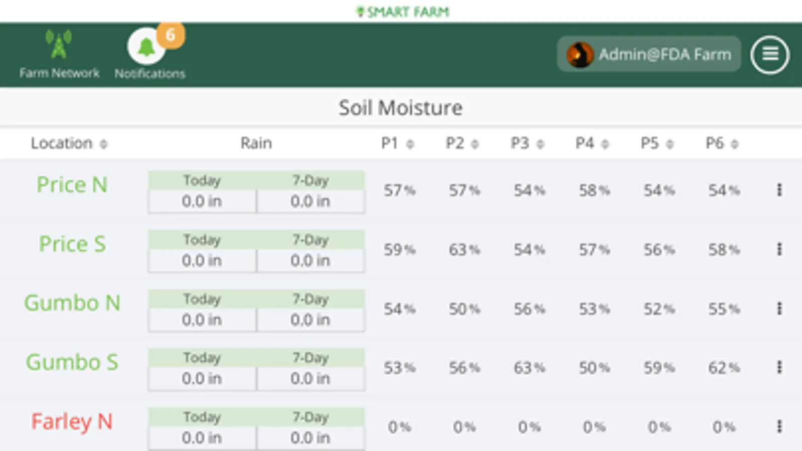 Soil moisture graph shows trend lines associated with all soil monitoring probes at each node