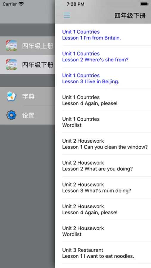 *根据教材配套,此应用为山东科技版(鲁科版)小学英语四年级上册、下册完全最新版。