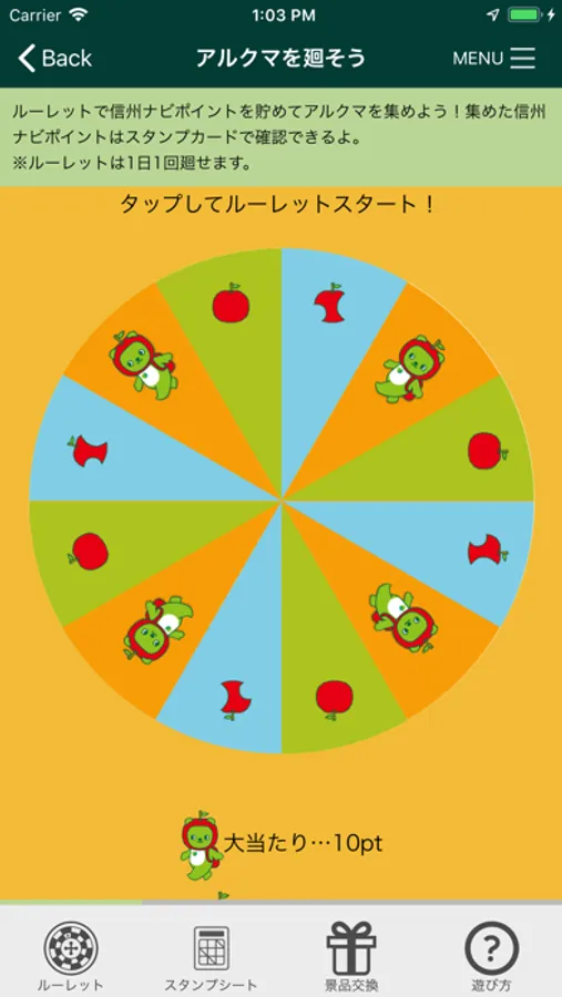 1日1回 回せるルーレットで信州ナビポイントを集めてアルクマを集めよう!