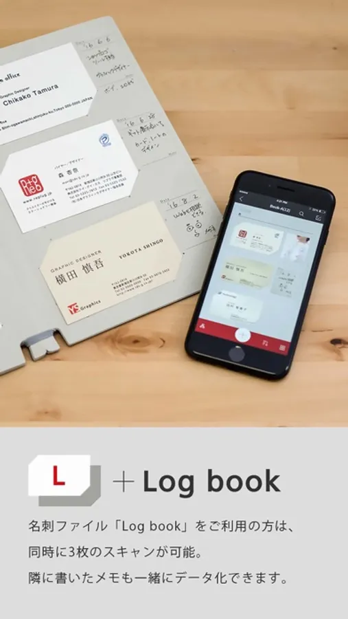 名刺の横にメモができる名刺ファイル「Log book」をご利用の方は同時に3枚のスキャンが可能です。アナログとデジタルの一括管理ができ、より便利でスマートにお使いいただけます。