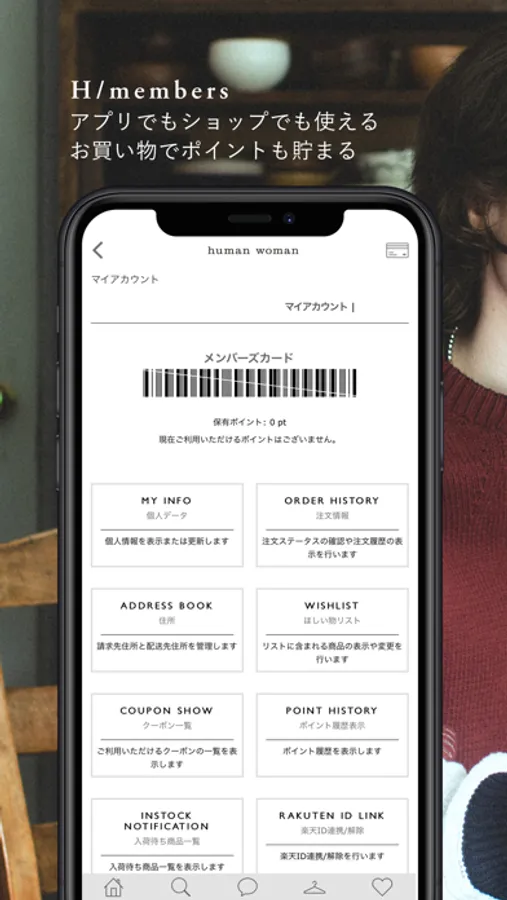 メンバーズカードとしてご利用できるほか、新規入荷情報やスタッフコーディネートをご覧いただけます。