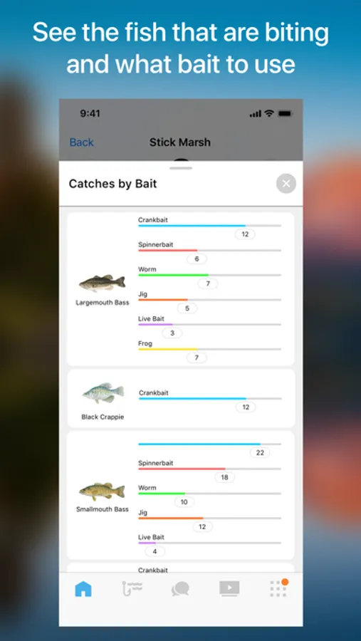· Bait recommendations for top species in lakes based on season, sky condition, water clarity and wind.