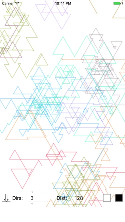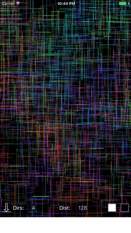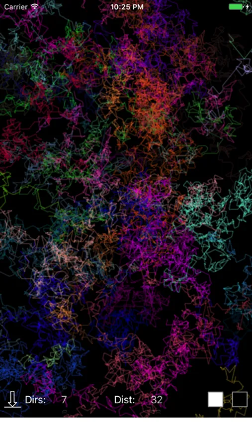 Number of directions and maximum travel distance of each step can be changed. Different patterns will be drawn stochastically depending on these parameters. You can save resulting images to photo album.