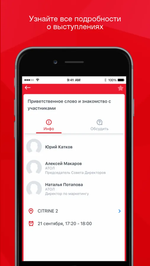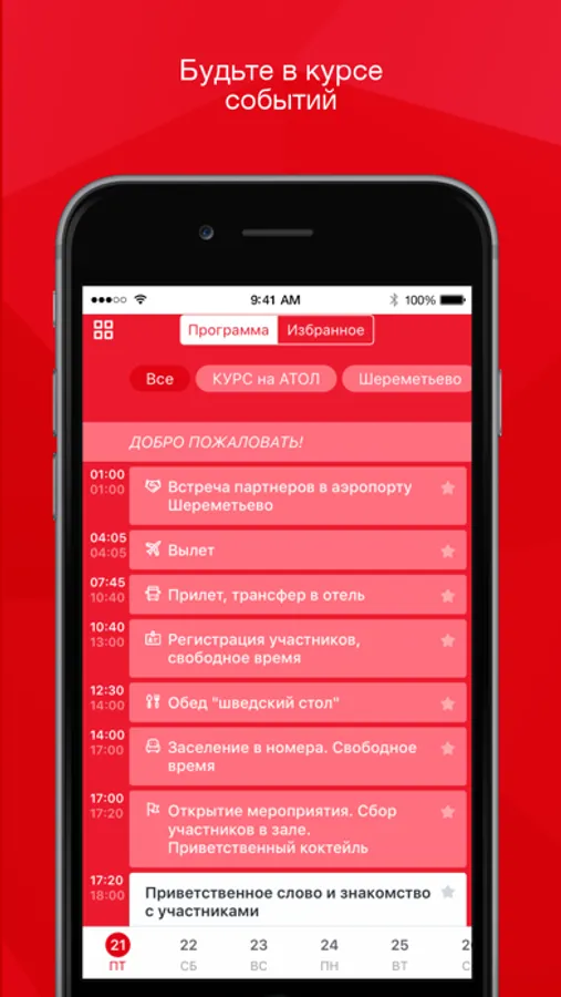 - составить собственную программу и получать оповещения о начале избранных докладов;