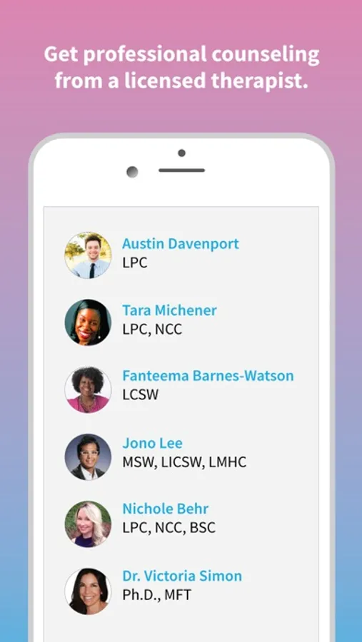 All therapists on Regain have at least 3 years and 1,000 hours of hands-on experience. They are licensed, trained, experienced and accredited psychologists (PhD/PsyD), marriage and family therapists (MFT), clinical social workers (LCSW), licensed professional counselors (LPC), or similar credentials.