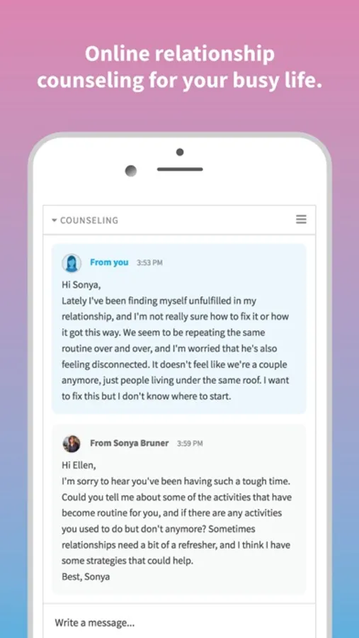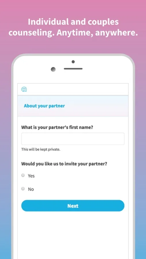 After filling out our questionnaire, you will be matched with a licensed therapist based on your needs and preferences. You and your therapist will get your own secure and private “therapy room” where you can message your therapist at any time, from any internet-connected device, wherever you are. Your partner will be invited to this room as well if you decide to try therapy together. You can also schedule a session so speak live with your therapist over video or phone.