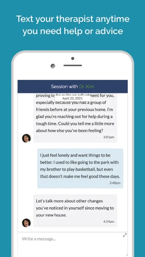 Teen Counseling lets you connect with a licensed therapist who specializes in helping teens like you. Whenever you need and wherever you are, just text your therapist or schedule a video or phone call. Your therapist is here to help you thrive!