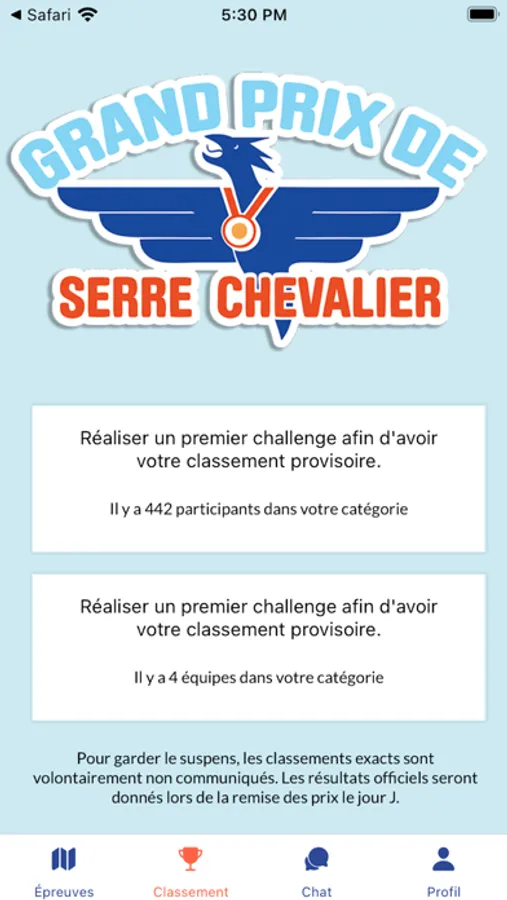 On y retrouve toutes les informations pratiques sur le parcours et permet de suivre en temps réel son score et celui des autres participants.