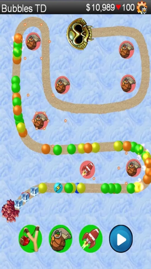 The objective of the game is to install your weapons to prevent the bubbles travelling along the path from reaching the end. Use coins, earned by shooting bubbles, to buy new weapon and upgrade existing ones. Watch out against the BOSS bubble – it has multiple lives and shoots back at your weapons. Choose between different routes and different difficulty levels.