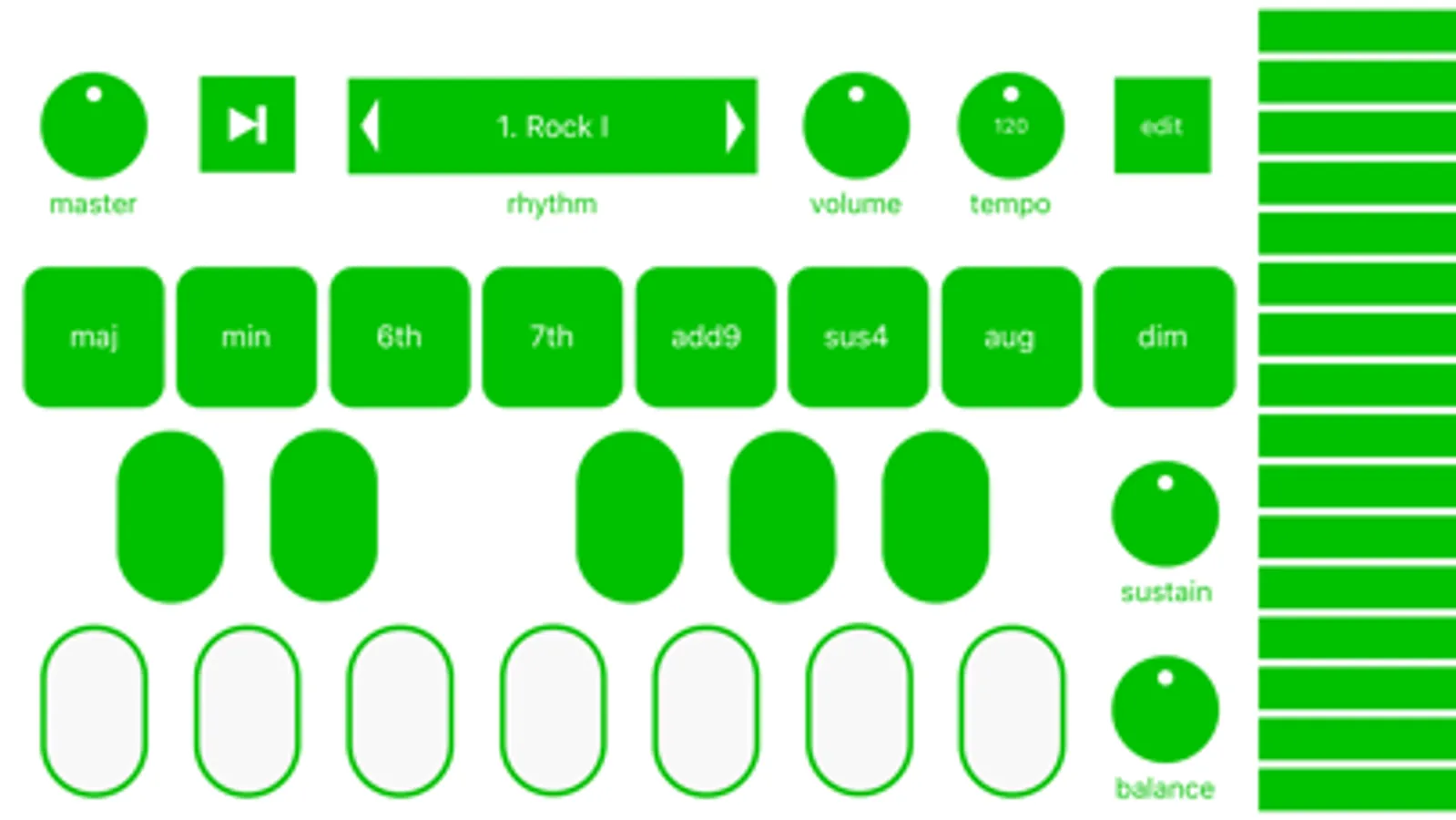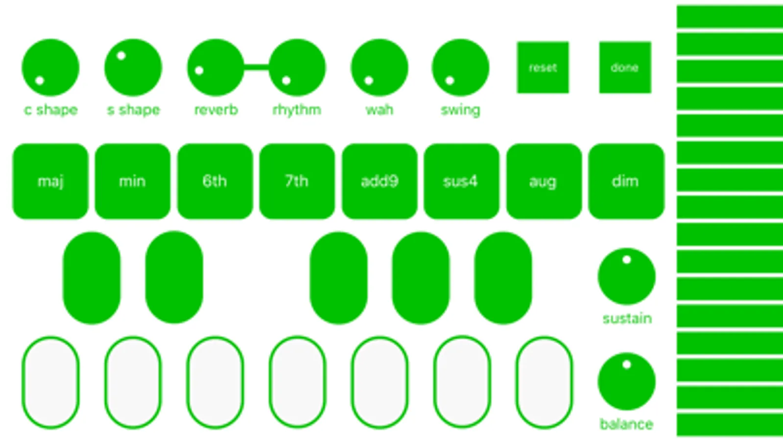 Accordo is a retro inspired chord machine in the vein of the Suzuki Omnichord. Select the root note from the keyboard and choose from 8 different chords, then use the strum strip to play the chord just like an autoharp. Includes a built in rhythm machine and adjustable effects like wah and reverb.