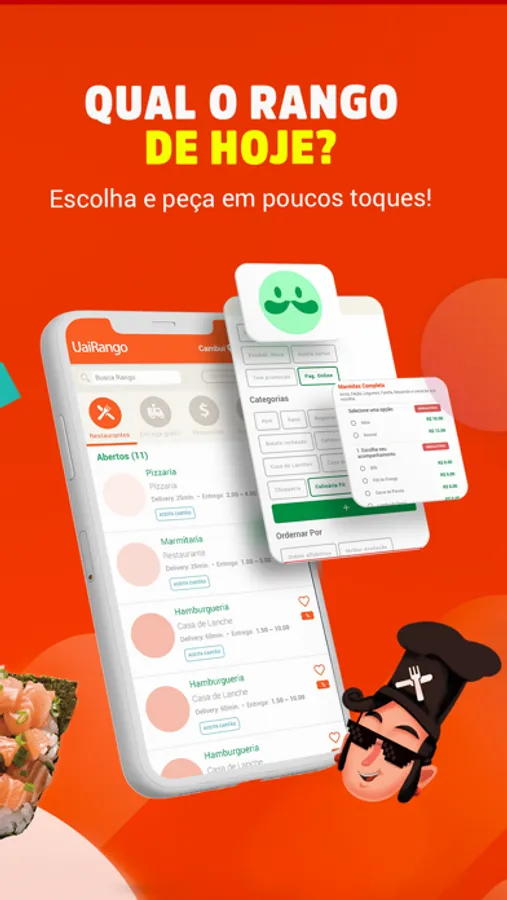 O Uai Rango é uma ferramenta que busca facilitar o serviço de delivery usando o canal de comunicação que cada vez mais cresce no mundo: a internet. Você pode realizar pedidos nos melhores estabelecimentos, sem passar um tempão no telefone e sem dor de cabeça. É simples, seguro e moderno.
