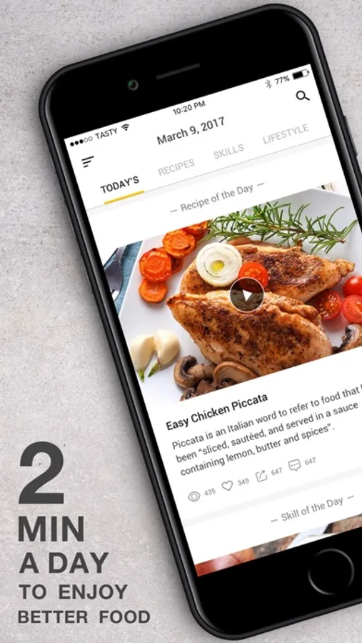 2 minutes a day to enjoy better food! Get tasty recipes daily that anyone can cook through quick step-by-step videos! Improve your delicious food prep skills through short tips and tricks videos delivered each day!