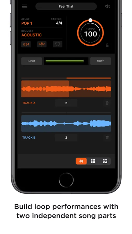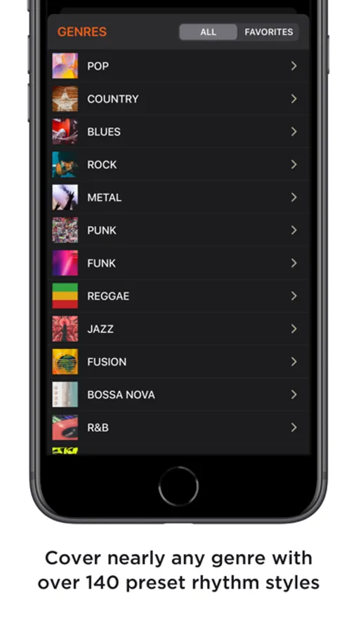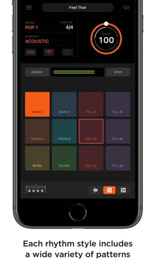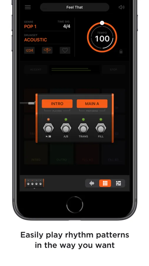 Easily play rhythm patterns with loop pads. Each rhythm style includes 12 rhythm patterns: intro, verse, chorus, six fills, two transitions, and outro. You can switch rhythm patterns in real-time as needed during your performance.