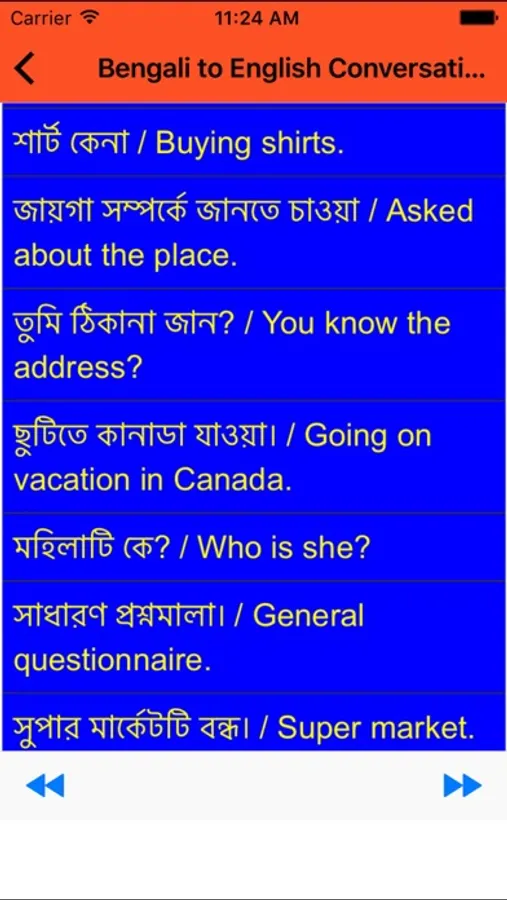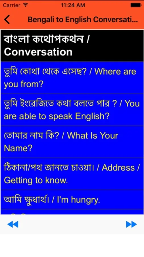 Bengali to English Conversation- Learn Bengali app is developed for English talking people. The main objective is to help people who speak English to talk in casual Bengali (Bangla) language. Two languages were incorporated here. Bengali-Japanese-English. It will be useful when someone wish to visit Bangladesh or talking with Bangla speaking people. Please remember, this application will not make you expert in Bangla but make you easy to talk in daily Bangla conversation.