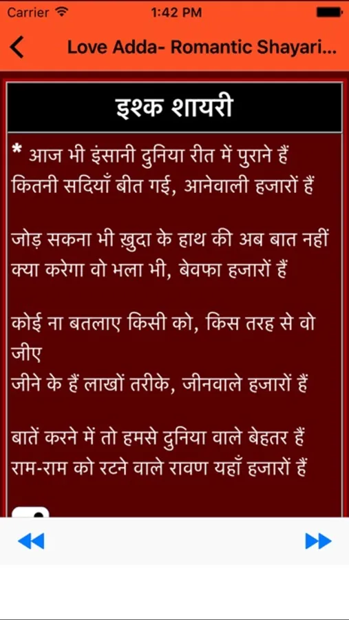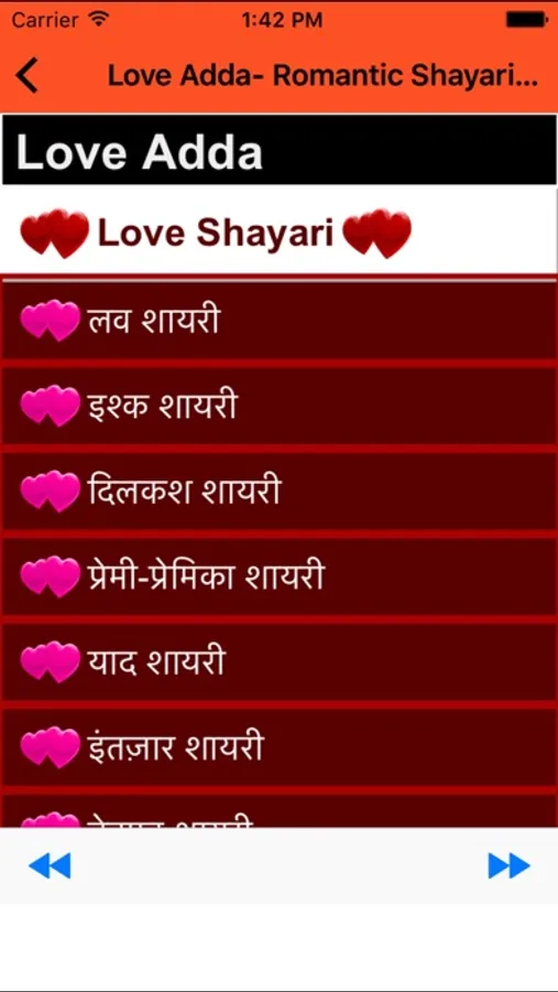 Egs: How to represent your emotions to make a relationship strong. How to win over your love if she is not happy with u. Here you can find kissing tips, love smses to send someone,shayaris,poems. You can get all tips related to love in this app. All the romantic hearts out there!!! This app is for you all. So go ahead and express yourself to your love. This app is useful for those who miss their love and want to sing romantic poems for them. This app has solutions for many such love related questions and the various categories present in this Romantic shayari sms poems app are: