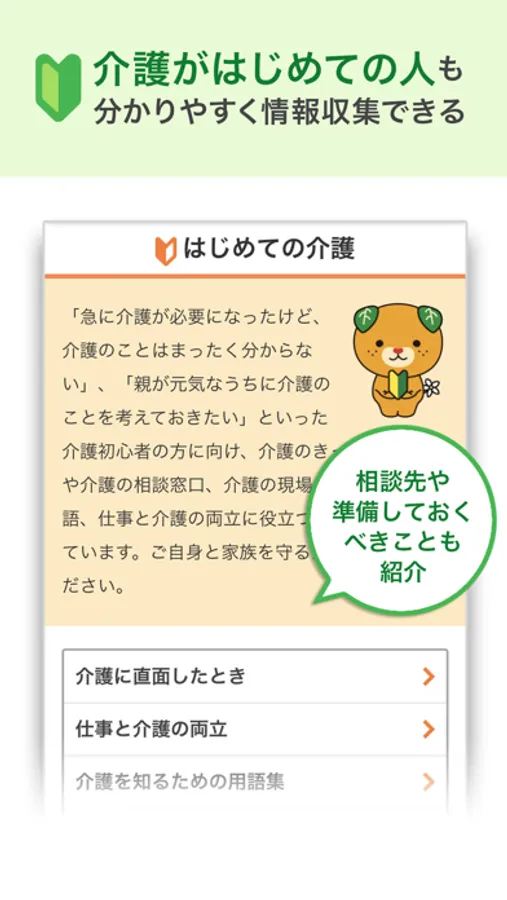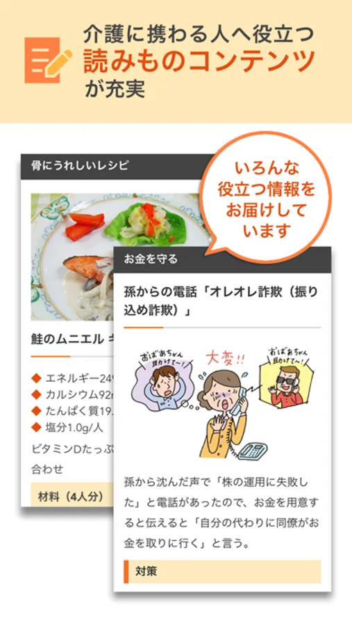 このアプリでは、そういった方のために介護についてわかりやすく解説した「はじめての介護」や、介護の相談先となる「地域包括支援センター」の情報、愛媛県内各地にある介護事業所の検索、介護に関するQ&A、そのほか毎日の献立に役立つ管理栄養士監修のレシピなど、介護に関する情報が満載です。