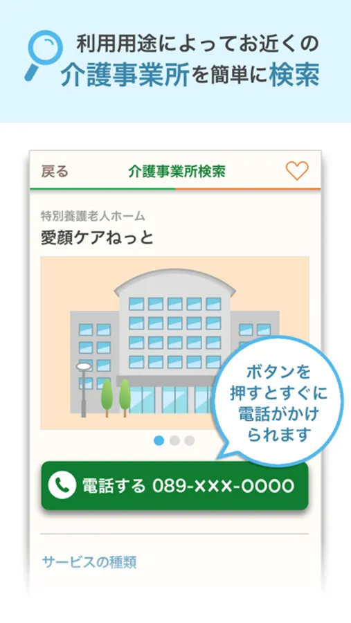 愛媛県の公式アプリ「愛顔(えがお)ケアねっと」は、初めて介護を受ける方を家族にもつ事になった方や介護従事者の方に向けた、介護に関する情報アプリです。