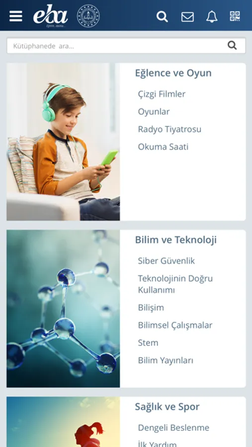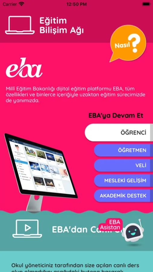 Mobil cihazınız ile EBA uygulamasını yükleyerek platformdaki etkileşimli içeriklere ek olarak video, ses, görsel, doküman, kitap ve dergi içeriklerine ulaşabilir ve farklı bir uygulamaya ihtiyaç duymadan canlı derslerinizi gerçekleştirebilirsiniz.