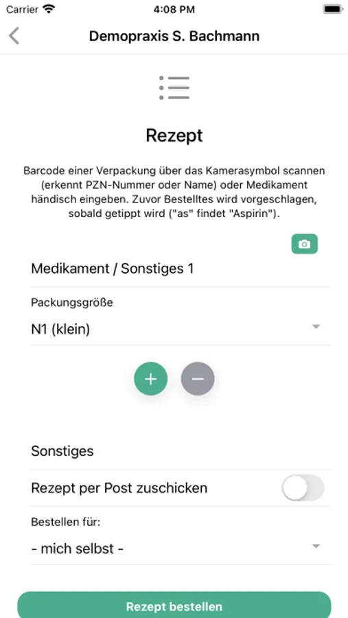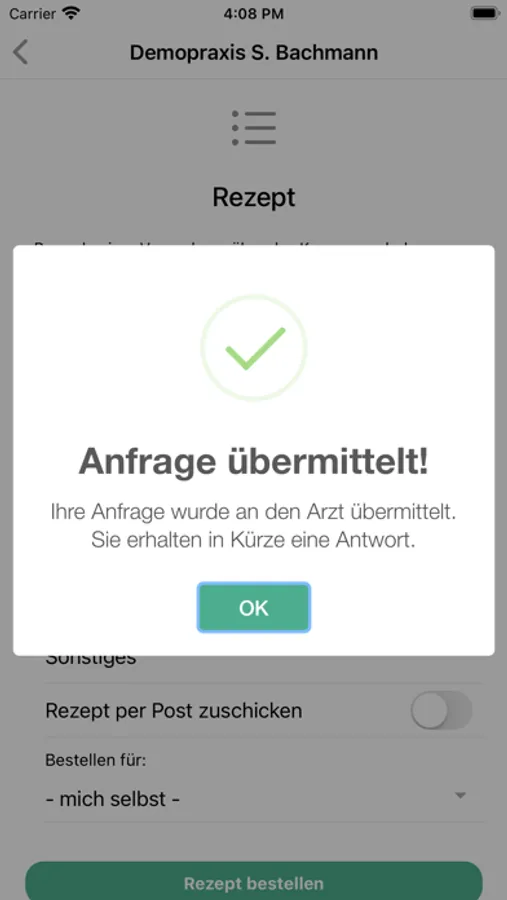 Daneben stehen strukturierte Anfrageoptionen zur Verfügung. Diese ermöglichen bspw. Termin-, Rezept- oder Überweisungsanfragen, ebenso wie einen Versand von Bildern, sofern die Praxis diese Funktion aktiviert hat.