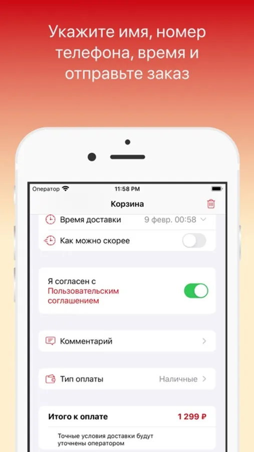 Сделать заказ в приложении «Японика» очень просто: выберите понравившиеся позиции из меню, добавьте их в корзину и перейдите на экран оформления заказа (по нажатию на иконку корзины).На экране заказа добавьте свою контактную информацию для первого заказа: Имя, Номер телефона и адрес электронной почты, чтобы получать уведомления об оплате. Укажите время когда хотите прийти за своим заказом или выберите доставку с указанием времени и адреса доставки. Примите правила оплаты и нажмите кнопку “Заказать”.Ваш заказ поступит оператору, и к назначенному времени мы его приготовим. Оплата производится наличными курьеру в соответствии с чеком.