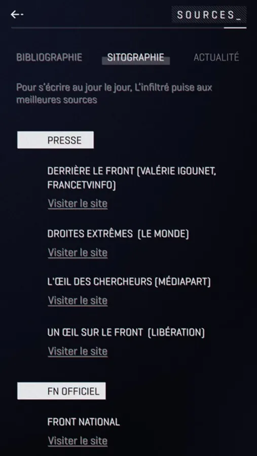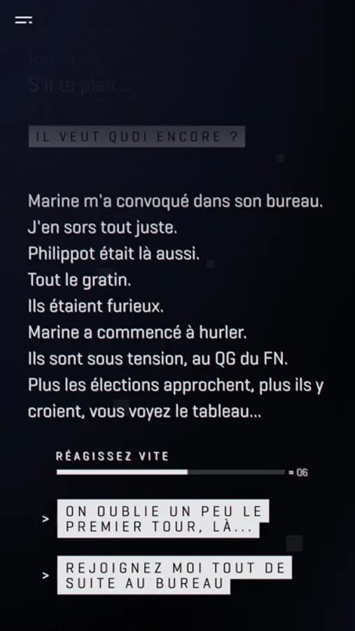 Premier volet de la collection PhoneStories, L’infiltré vous plonge dans la peau d'un officier de la Direction générale de la sécurité intérieure. Vous devez guider un de vos agents, au coeur de la machine électorale du Front national. Votre aventure est mise à jour en temps réel.