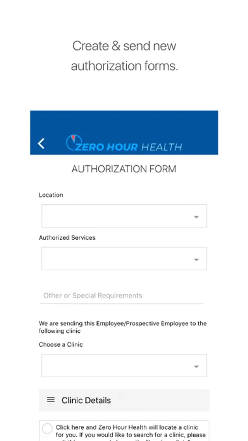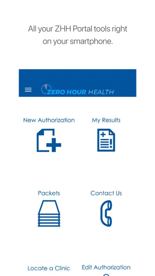 The ZHH Portal provides access to Zero Hour Health’s employee health services portal. Resources include authorization input, patient forms, a clinic search tool and status updates. Clients can also reach the ZHH Customer Service Team quickly, right from the app.