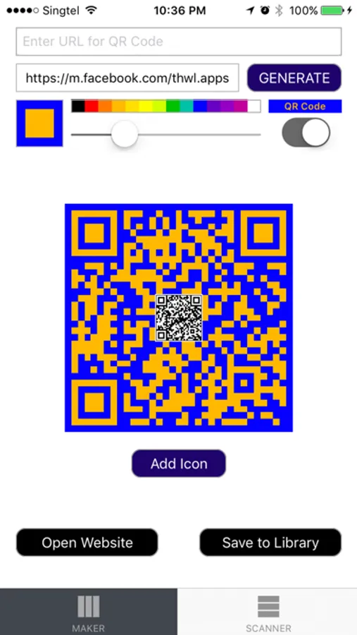 Make a colorful QR Code for a website URL with ease! Add an optional icon at the centre of your QR Code for branding! The QR Code designed by you will be saved to your iPhone's Photo Library for your usage!