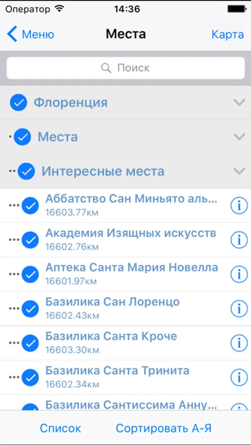 ● ПРОГУЛКИ ПО ФЛОРЕНЦИИ. Не все интересные места, которые стоит посетить во Флоренции, можно включить в экскурсионные маршруты. Составьте свой собственный план прогулки по Флоренции, просто выбрав в каталоге нужные места, и они сразу будут отображены на карте. При этом остальные объекты вы можете просто убрать с карты.