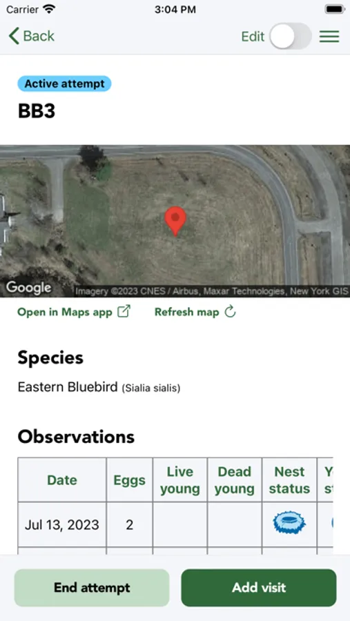 •Add data on species, number of eggs, number of young, hatch date, and other pertinent details.