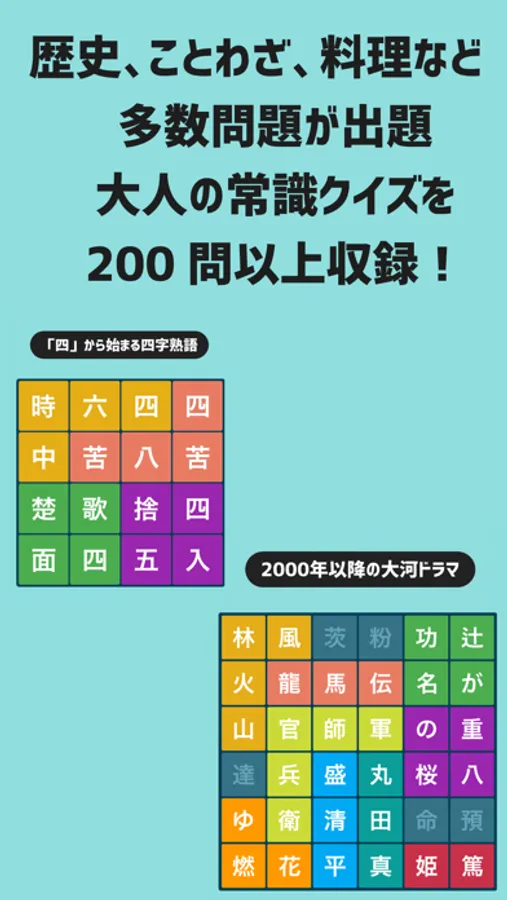 など、地理や歴史、四字熟語、ことわざ、料理、生き物、スポーツ、一般常識といった様々なジャンルから多数問題が出題されます。