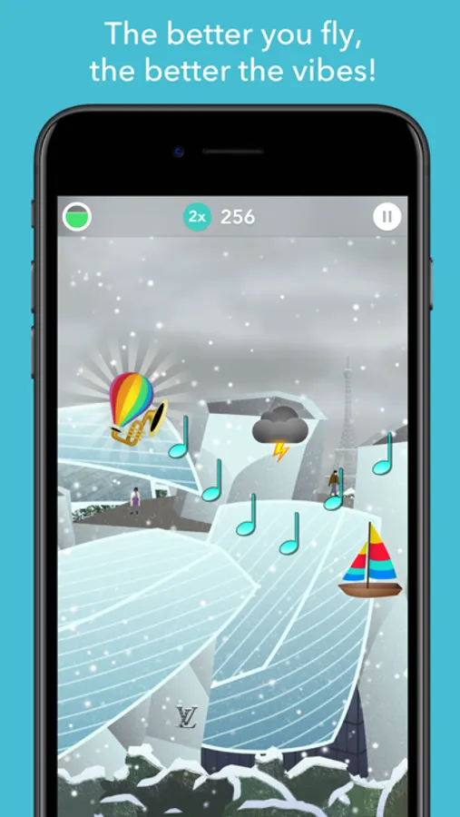 Collect as many notes as you can by guiding your ‘tuballon’ above the sails of Frank Gehry’s iconic building in Paris. Steer clear of the crazy floating obstacles and unlock four energetic levels, inspired by the dynamic architecture and life at the Fondation Louis Vuitton.