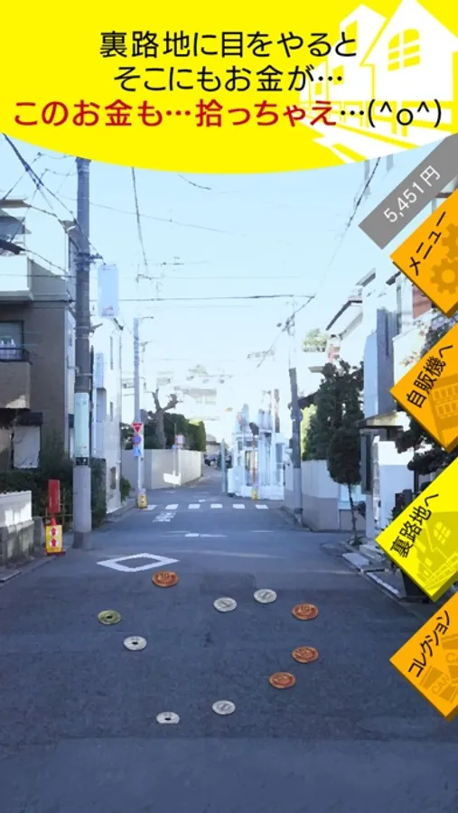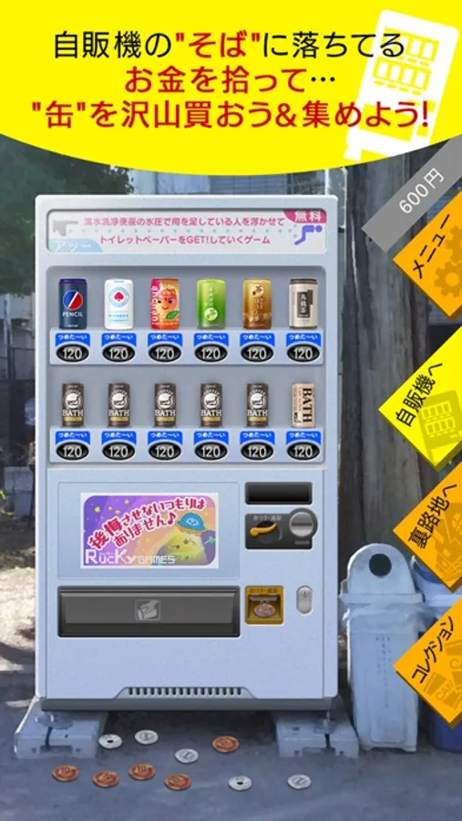 自販機の釣り銭部分や、下の小銭を拾って、そのお金で缶を集めるゲームです。