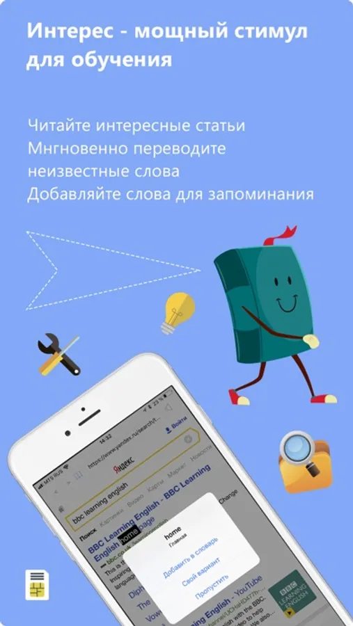 Встроенный переводчик позволит в любое время узнать перевод незнакомого слова и добавить его в список для изучения.