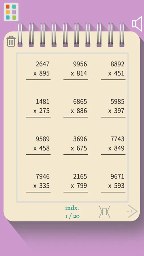 Math Loops will identify and verify your numbers as you write them by hand. It will highlight your mistakes while you solve the exercise. It will show and correct up to two errors in each multiplication. One more mistake ... and you have to start over;)