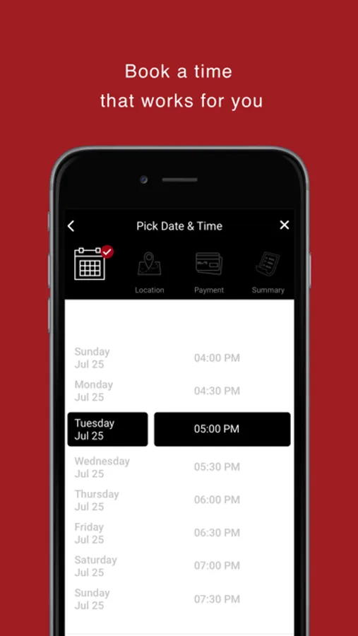 - Search for the available professional by indicating a date time, city and type of service requested.