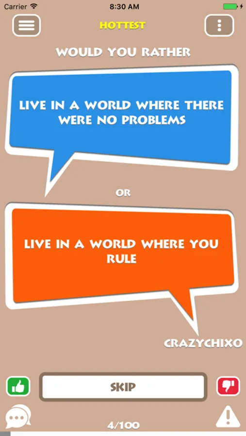 Keep track of what other are adding, but also add your own WYR questions. Have fun with your own creations too and keep track of them. Explore other profiles and see ranks, likes and comments. Enjoy the social part of WYR.