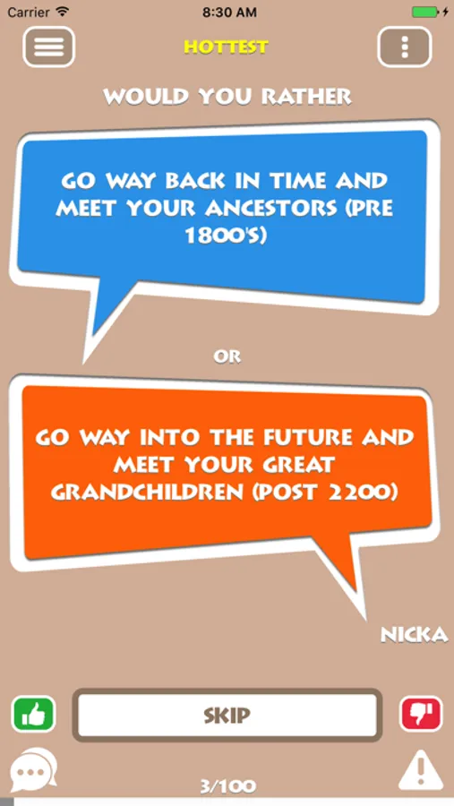 Your search through our Would You...? game questions can be truly fun. The feeling can be unpredictable and really unexpected when you see some of the questions listed here. When you explore the community, you will find the true spirit of the game and find truly interesting Would You...? questions that will glue you to your iPhone or iPad.